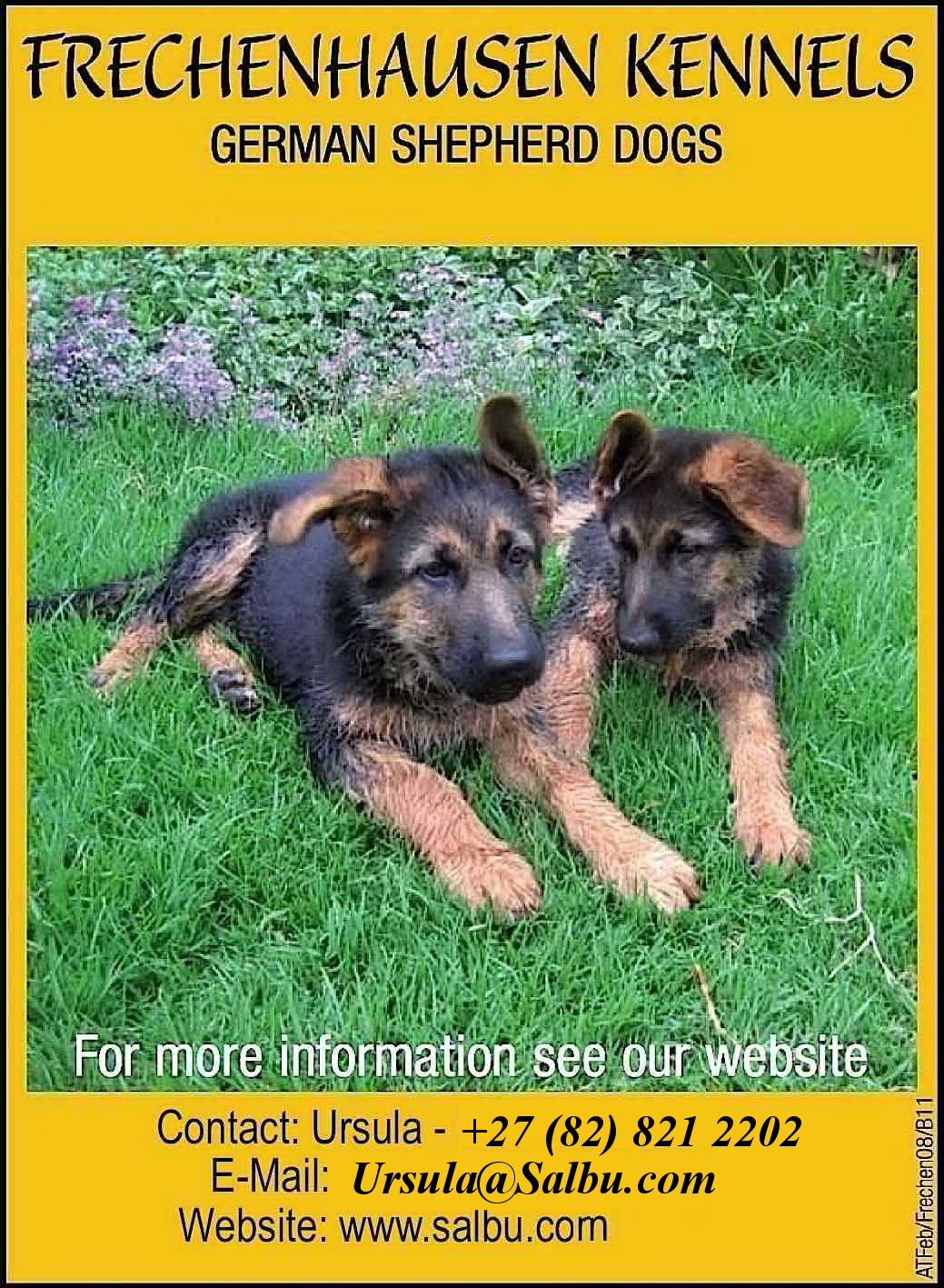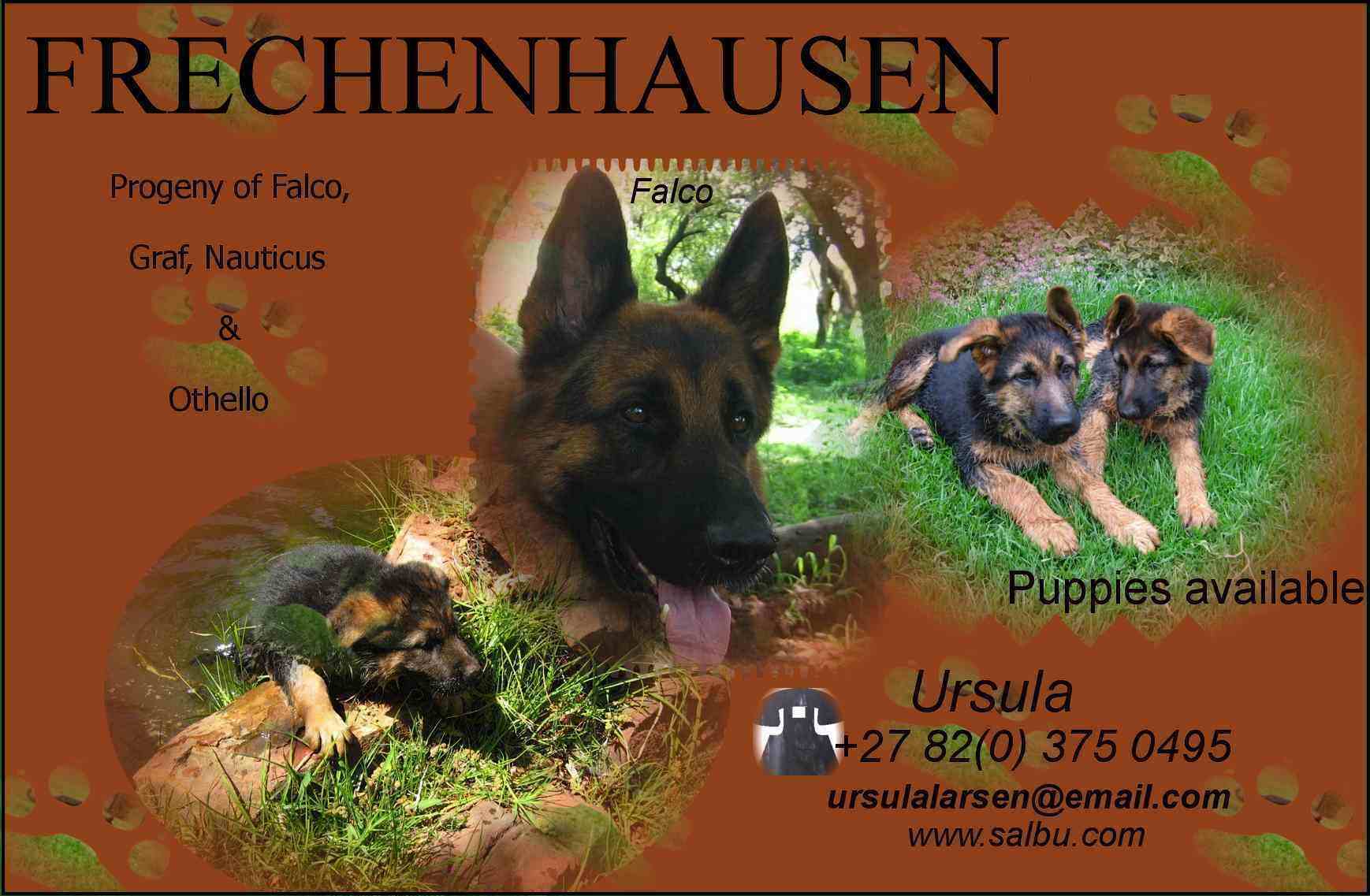 FRECHENHAUSEN KENNELS - INDEX PAGE GERMAN SHEPHERD DOGS - PUPPIES FOR SALE HOME PAGE - Contact Details and Location. ABOUT THE KENNELS - Back Ground and Photographs STUD DOGS - Listing of stud dogs. BREEDING STOCK - Names of the dams with photographs and background. EXTRAS - Articles and Links. FOR SALE - Puppies - Young Dogs - Older dogs Pictures of owners and their new pet- For future use Also visit our Blog: Frechenhausen.com and our Website 2: vonFrechenhausen.com Contact: Ursula - see banner below To search this site use the box below site search by freefind advanced (Counter Reset June 2012)