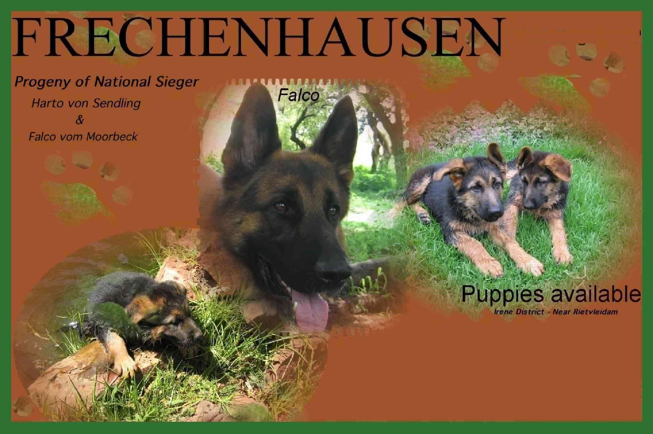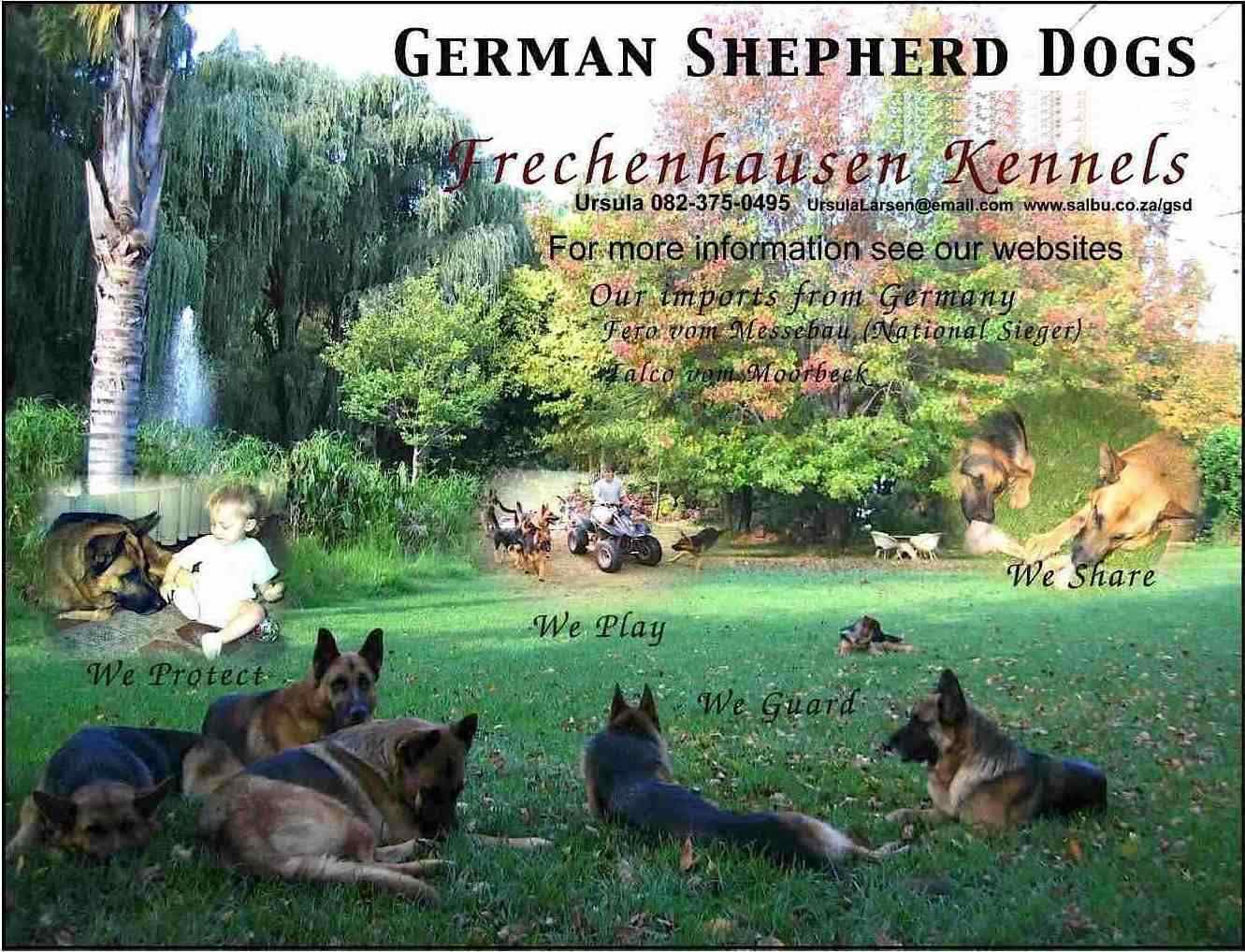 The Frechenhausen kennels are located adjacent to the Rietvlei Game Reserve in the Irene district of Centurion. The puppies enjoying playing in the spacious gardens. E-mail any comments to us E-mail any omments to us Frechenhausen Kennels: Return to Index Page